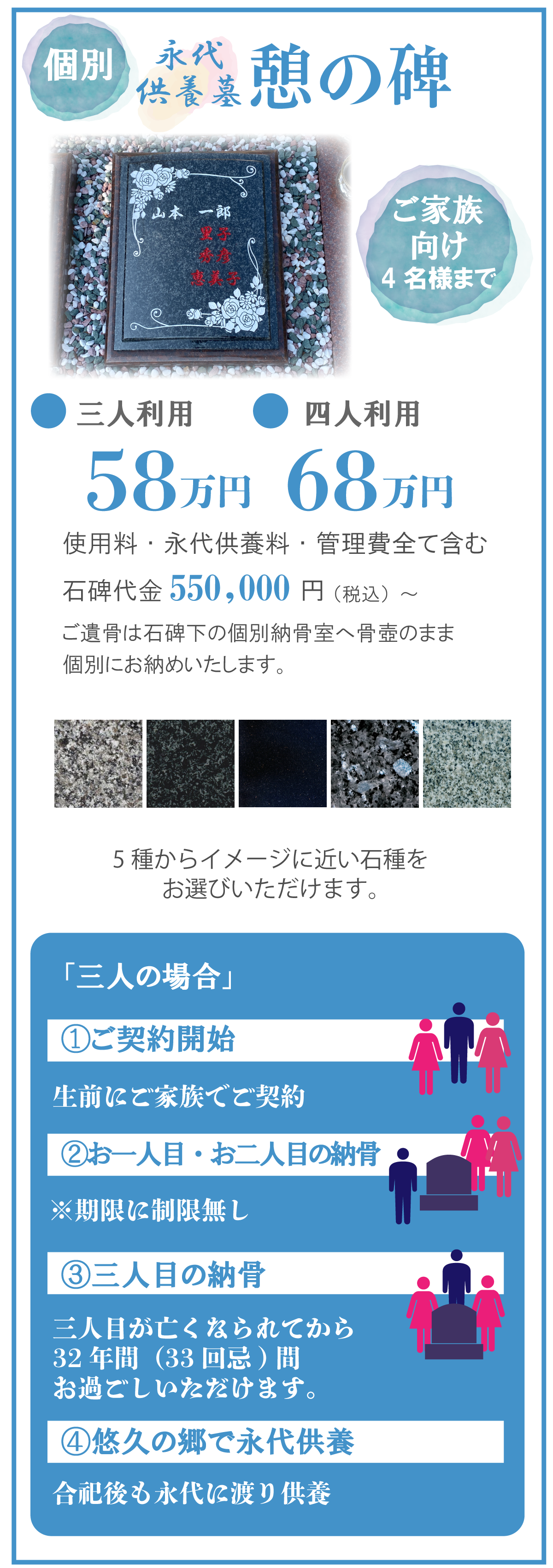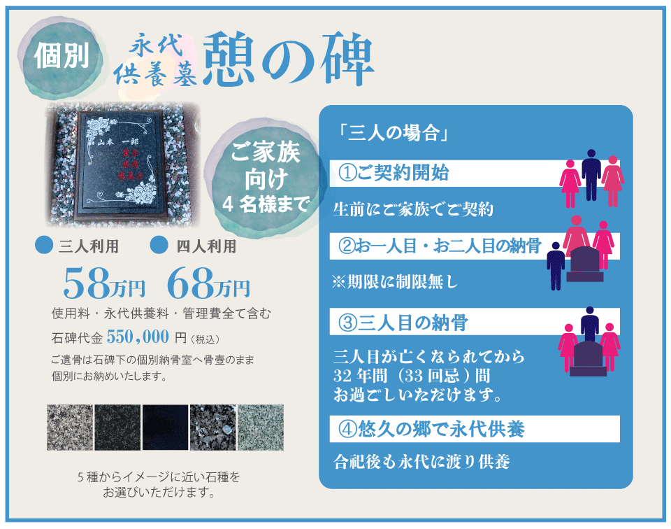 夢想庵の永代供養墓は、個別型の「結の碑」と合同供養の「悠久の郷」をご用意しております。個別型では、お好きなデザインやメッセージを刻むことができ、個別供養期間終了後は合同墓へと合祀され、永代にわたり供養されます。