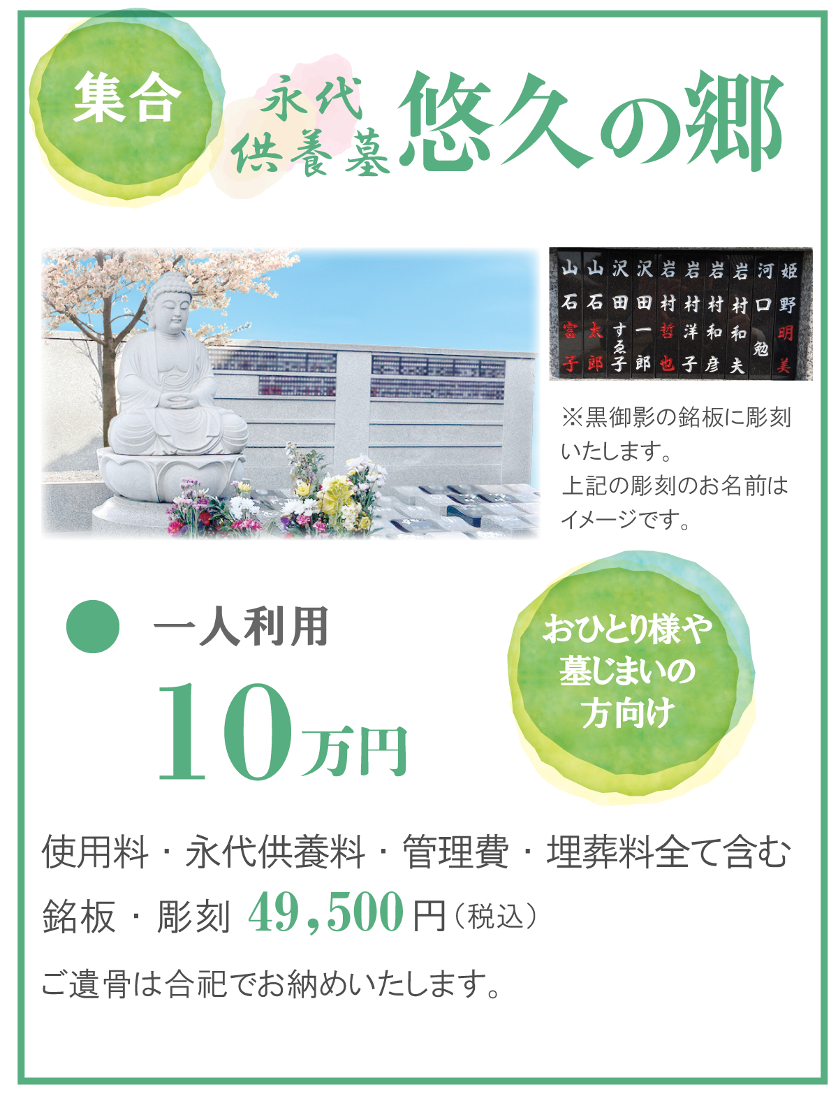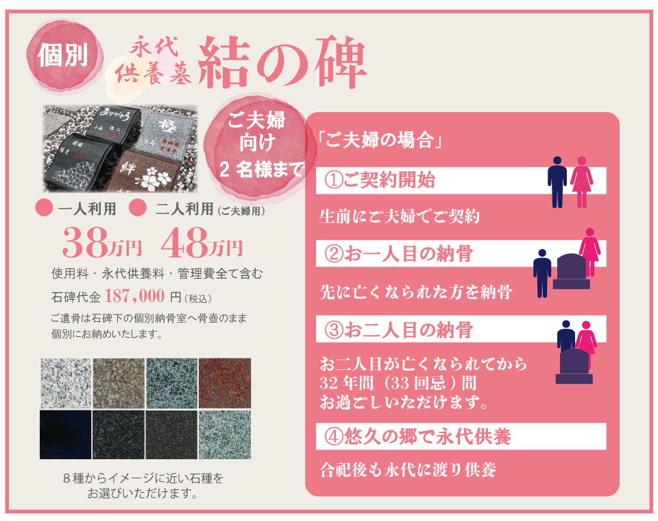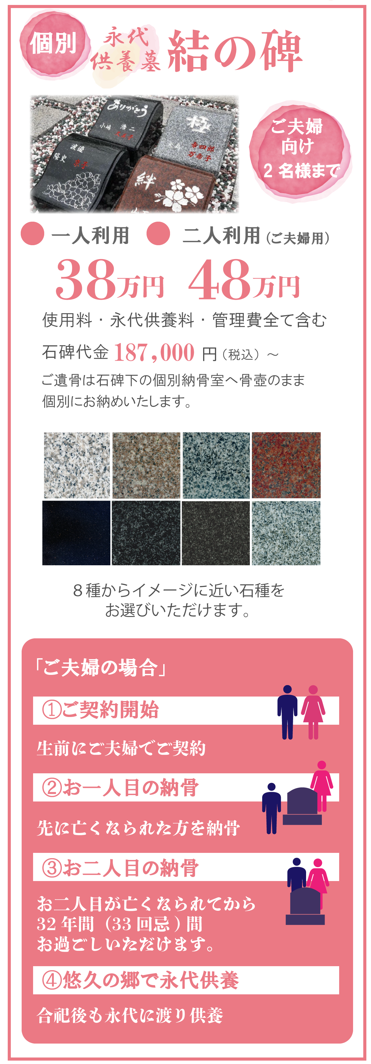 お一人やご夫婦、墓じまい後の先祖のご遺骨などお客様の用途に合わせて選べる永代供養プランをご提案しております。只今、ご夫婦・親子・兄弟に大人気の個別型「結の碑」が残り区画あとわずかとなっております。