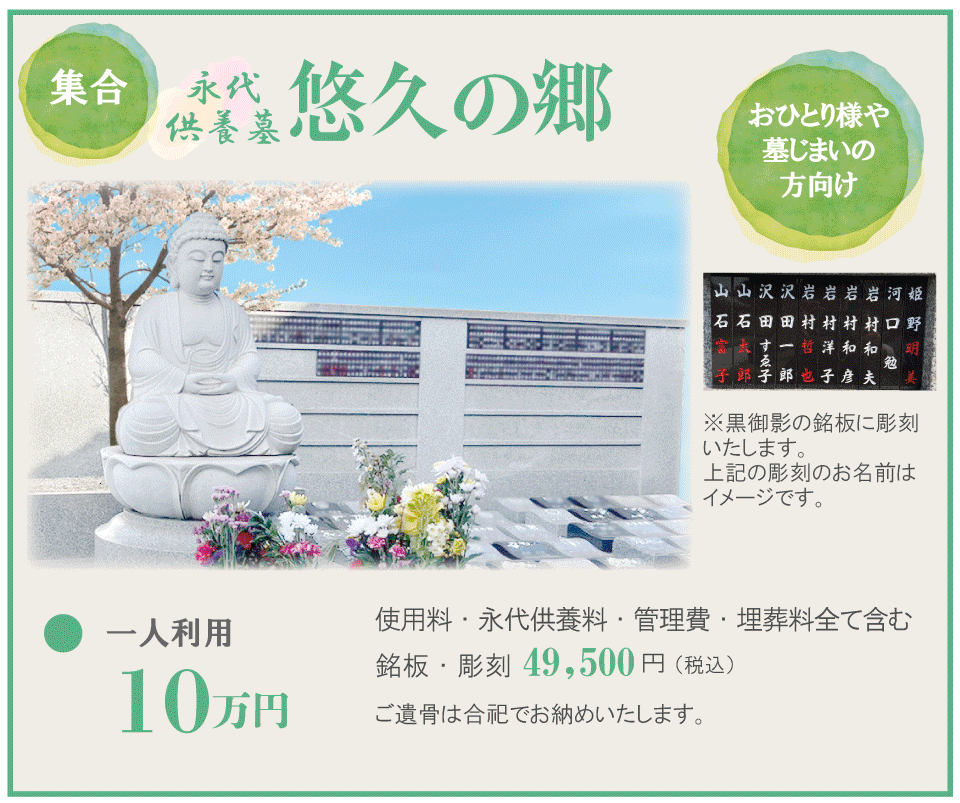 西福寺の永代供養墓は、個別型の「結の碑」と合同供養の「悠久の郷」をご用意しております。個別型では、お好きなデザインやメッセージを刻むことができ、個別供養期間終了後は合同墓へと合祀され、永代にわたり供養されます。