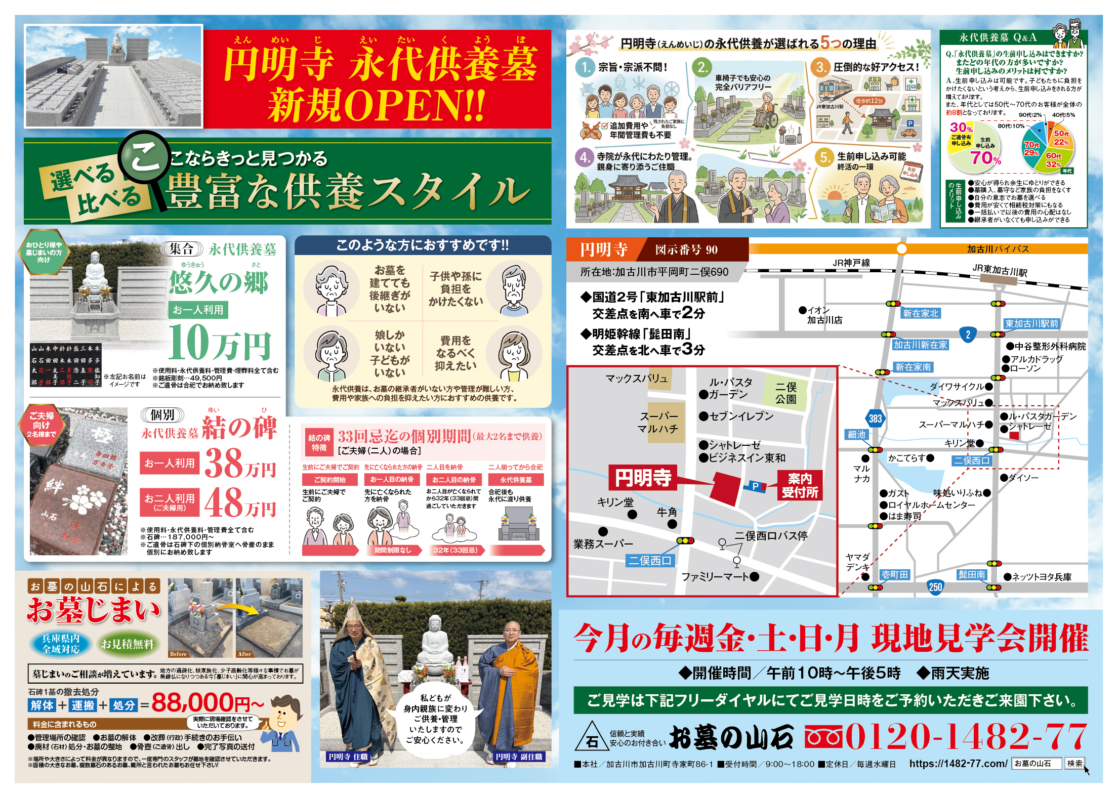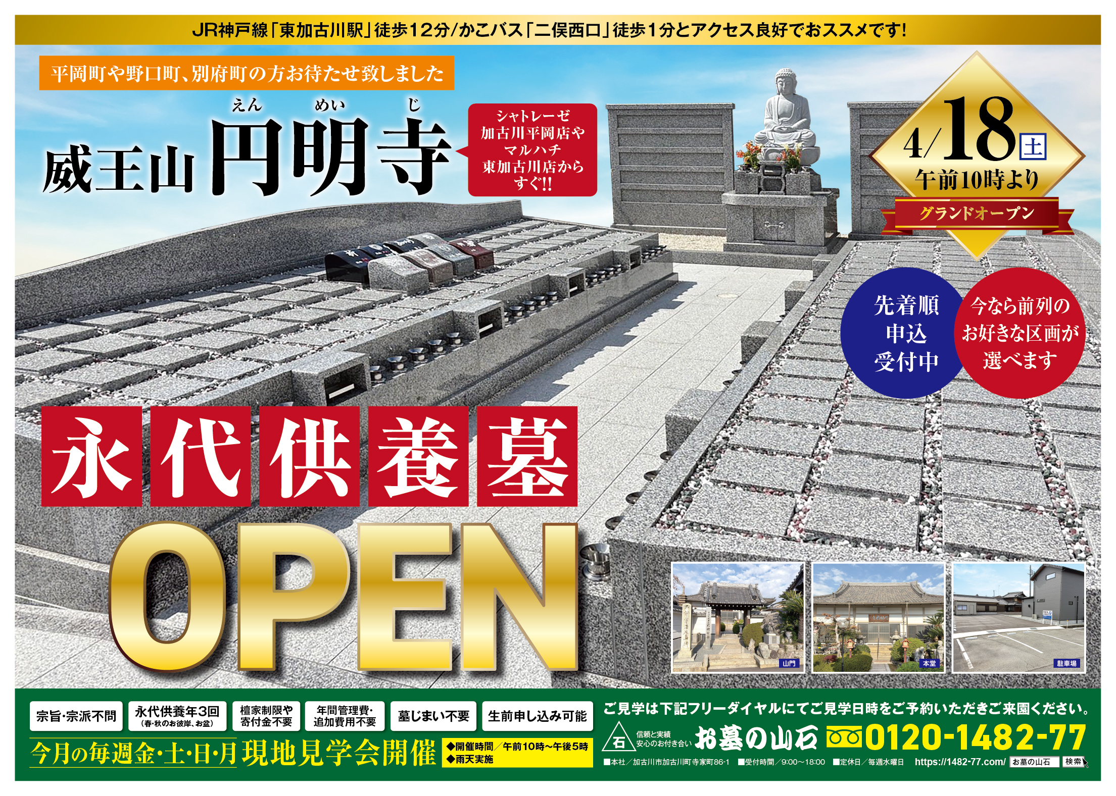 お墓の山石ではシャトレーゼ加古川平岡店やスーパーマルハチ東加古川店の近くに待望の円明寺「永代供養墓」が4月18日よりオープン致します。